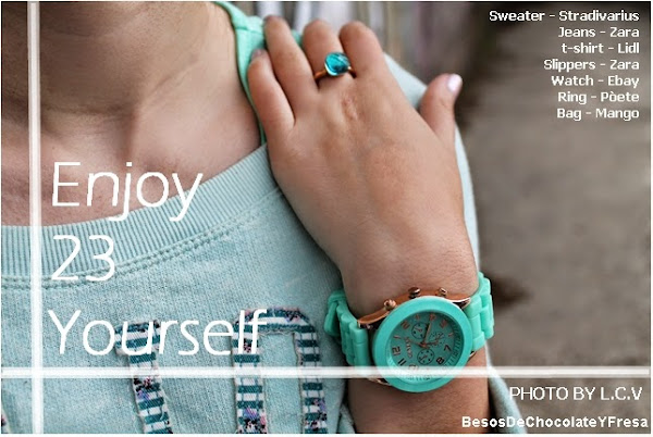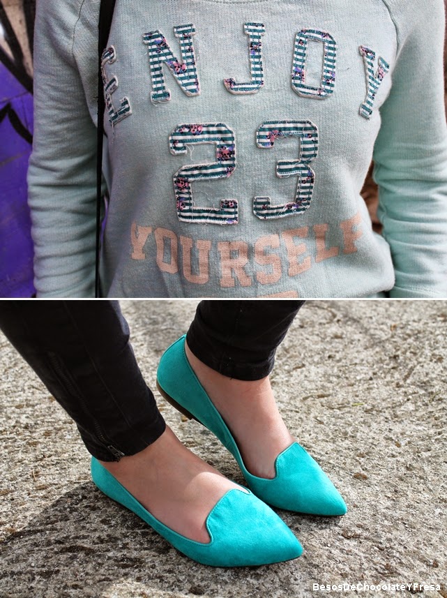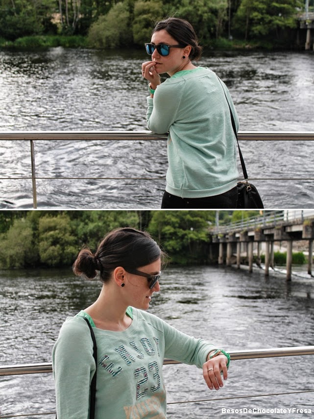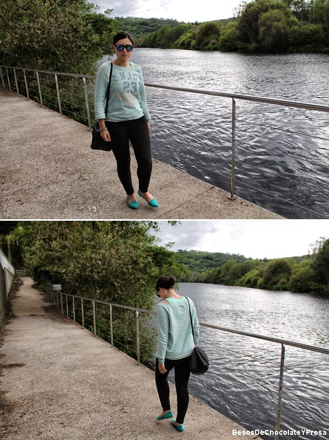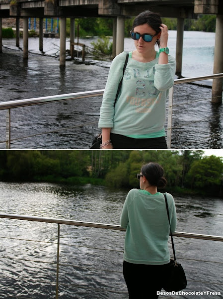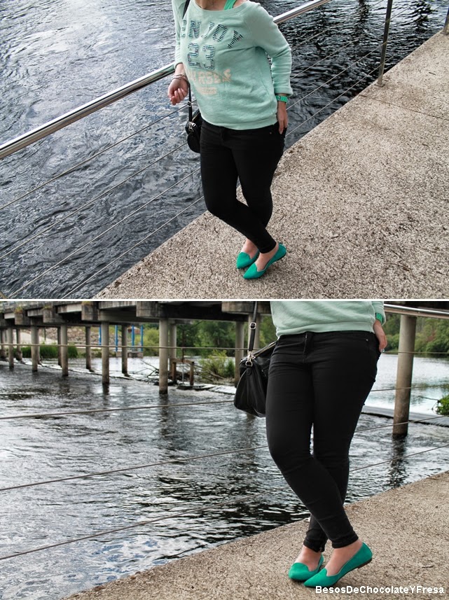 Hi! How are you? Today I bring you a comfortable look in shades of green mint, combining an easy color and it gives a lot of play at this time of year. This sweatshirt i wear 3/4 sleeve with black jeans and as complements, black tote bag and matching mint green slippers with clock and ring Pòete