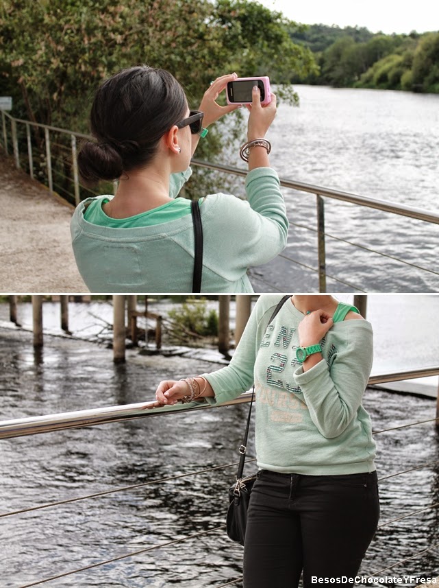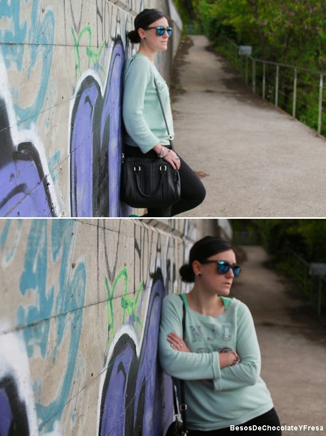 Hola!! ¿Qué tal? Hoy os traigo un look cómodo en tonos verde mint, un color facil de combinar y que da mucho juego en esta época del año. Para ello llevo sudadera de manga 3/4 con jeans negros y como complementos, bolso tote negro y slippers verde mint a juego con el reloj y el anillo de Pòete