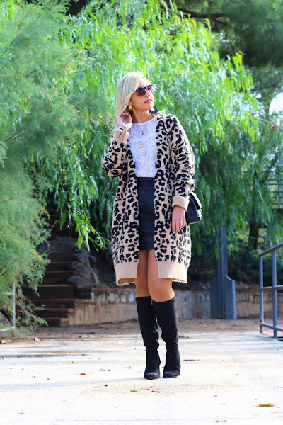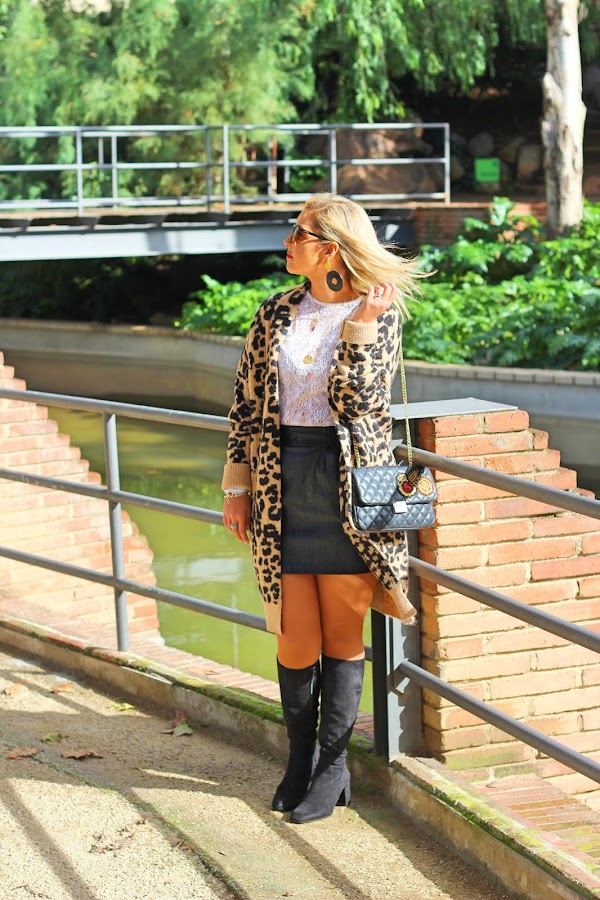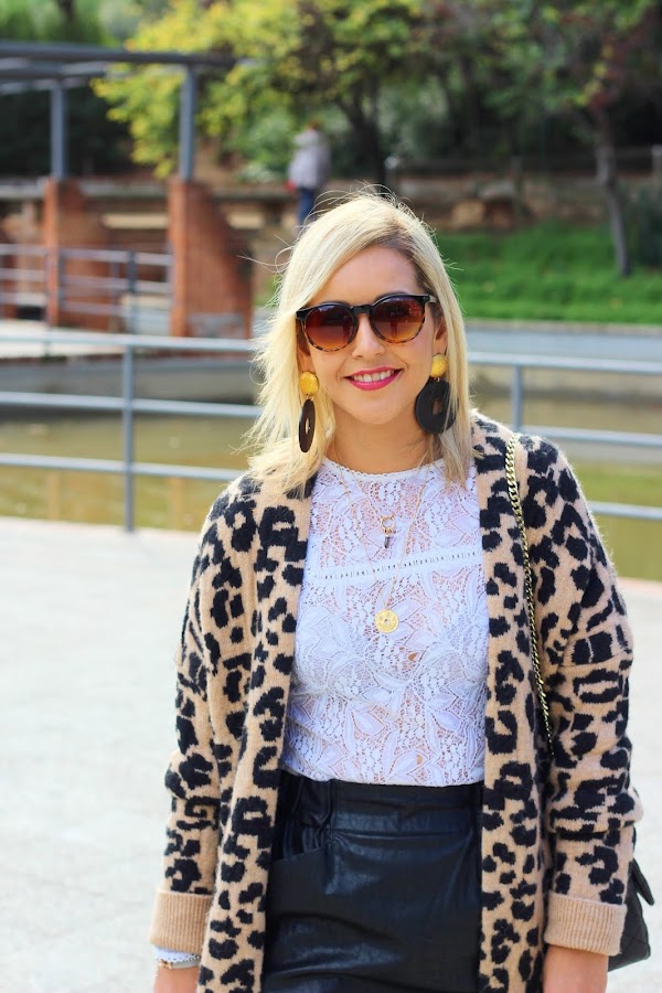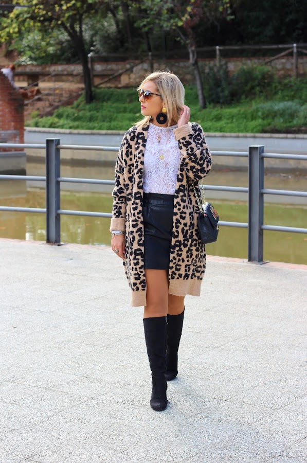 Today I show you a casual chic outfit with one of the trends of this season, the animal print. In the outfit of the day, I wear my new leather skirt from Zara with a white lace tee and a long knitted jacket with animal print. The rest accessories are my new black boots and my black bag with pins. A chic, comfy and warm outfit that its perfect to wear during the weekend.