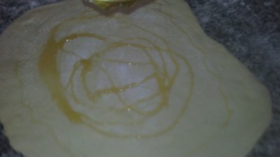 Extiende la masa con un rodillo, echa por encima unos chorritos de miel, enrollala como si fuera un brazo de gitano y forma la ensaimada.