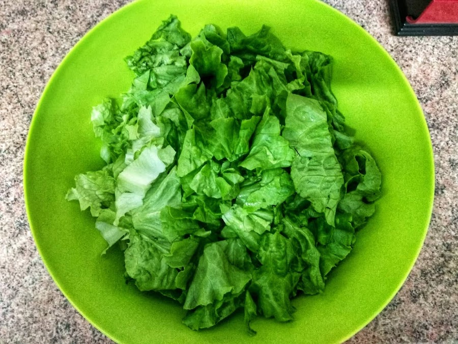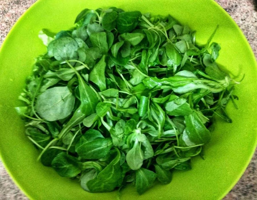 Troceamos la lechuga quitando el culo pero aprovechando al máximo. Ponemos a remojo la lechuga, los canónigos y la rúcula para que se limpien bien.