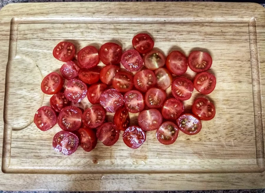 Lavamos y cortamos los tomates cherrys por la mitad.
