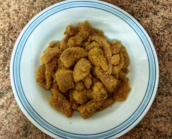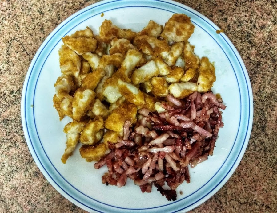 Freímos el pollo rebozado y el bacon, por separado y con muy poco aceite de oliva. He elegido este tipo de rebozado por eso mismo, absorbe menos aceite y por lo tanto es más saludable.