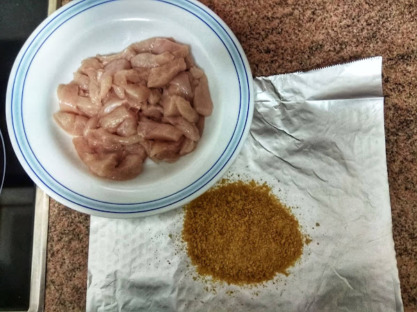 Cortamos la pechuga de pollo en dados o tiras lo que prefiráis y lo rebozamos.
