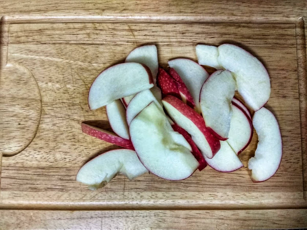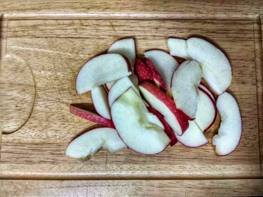 Lavamos y cortamos la manzana en rodajas, podéis pelarla si queréis pero a mi no me molesta la piel.