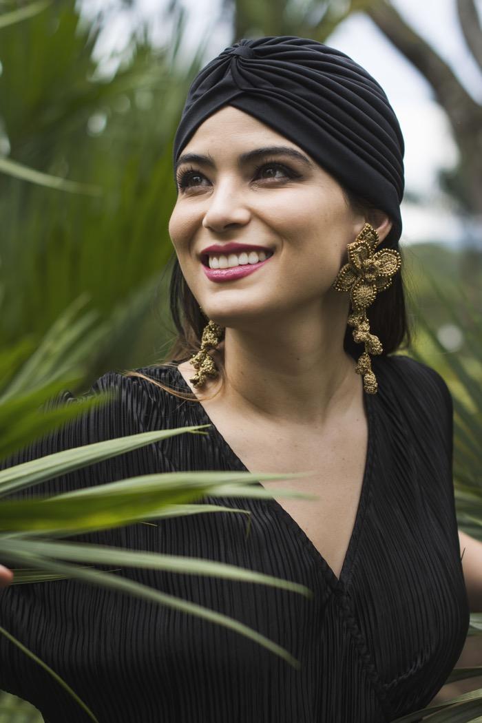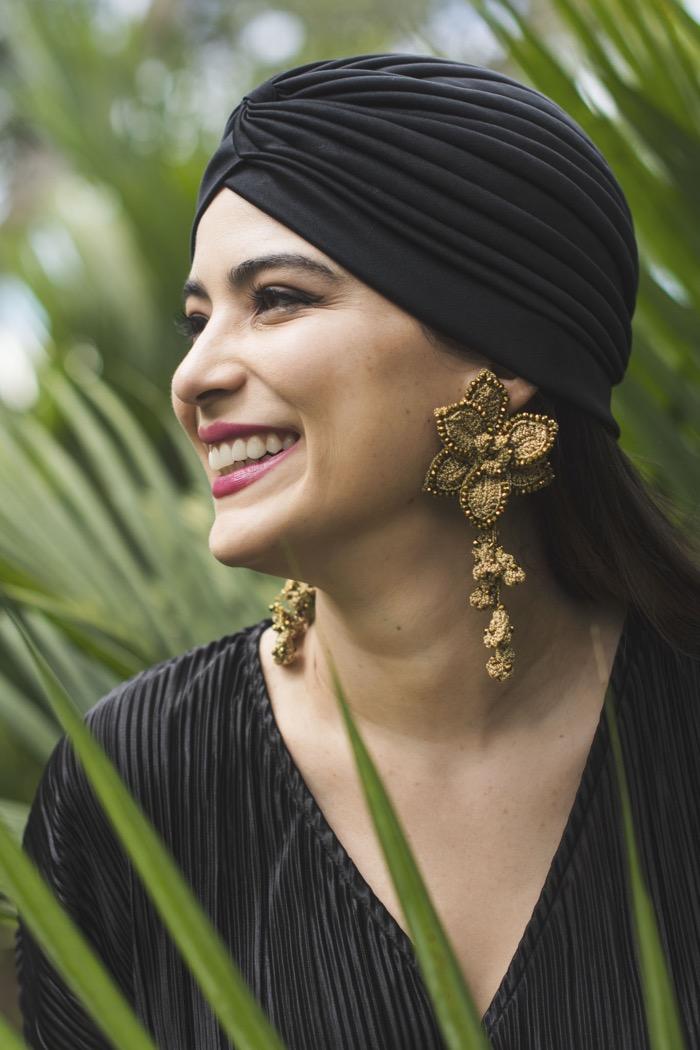 Al decidir llevar un turbante de este tipo y en el color de mi cabello, en un evento tipo coctel me parece necesario unos aretes vistosos que terminen el atuendo. La combinación de negro con dorado es de mis favoritas y de esas que siempre repito con facilidad. Estos aretes, al igual que los que he llevado durante este mes para el tema de accesorios, son de Tina Botero y los consigues en la tienda UVA TINTA.