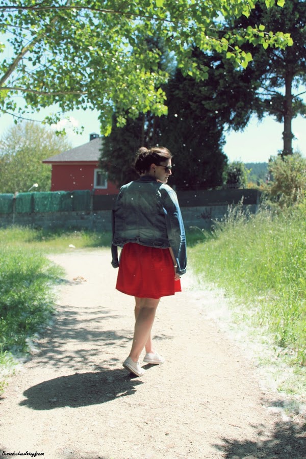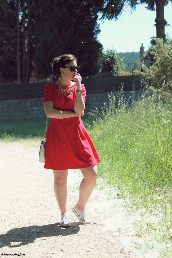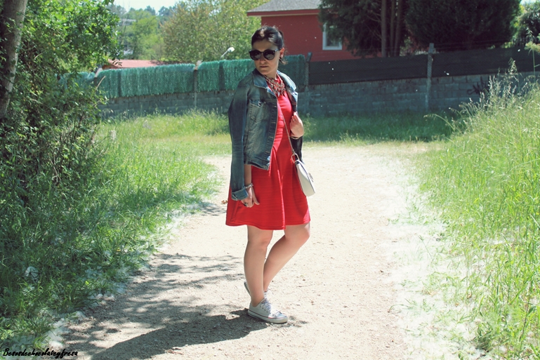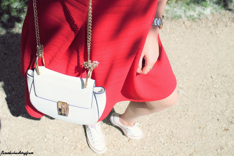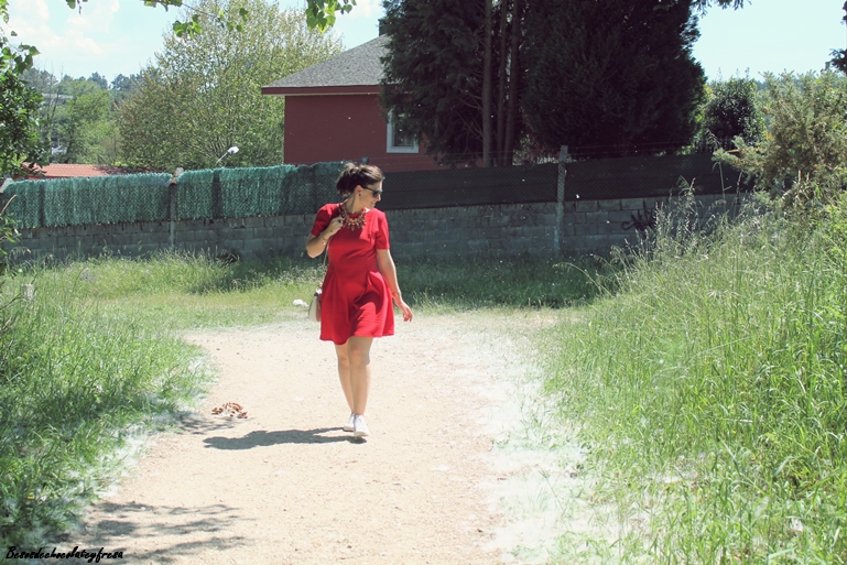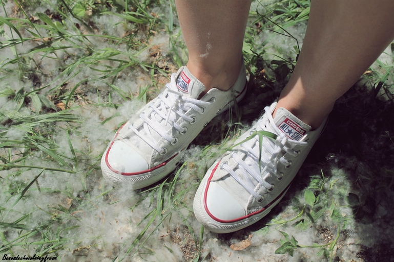 Para esta ocasión, una jornada de mucho calor y para una tarde de trote opte por las converse para darle un look más sport y desenfadado. Bolso blanco tipo Choé y collar en rojo completan el look. Todo en un lugar de cuento por el paisaje y los "algodones" que caían de los árboles.