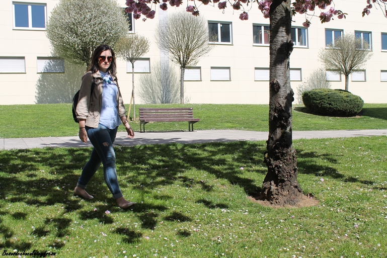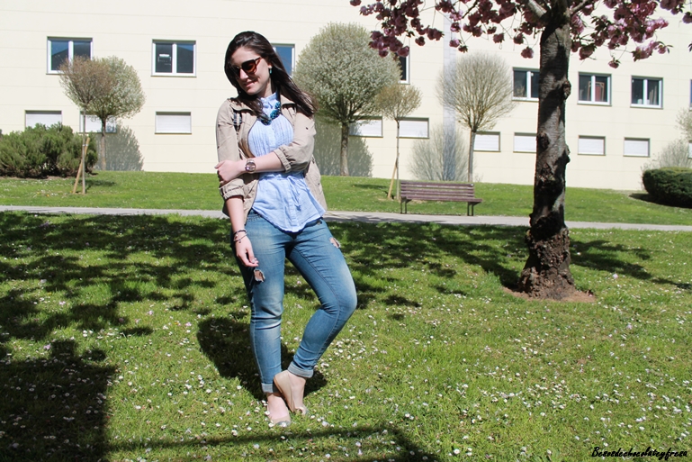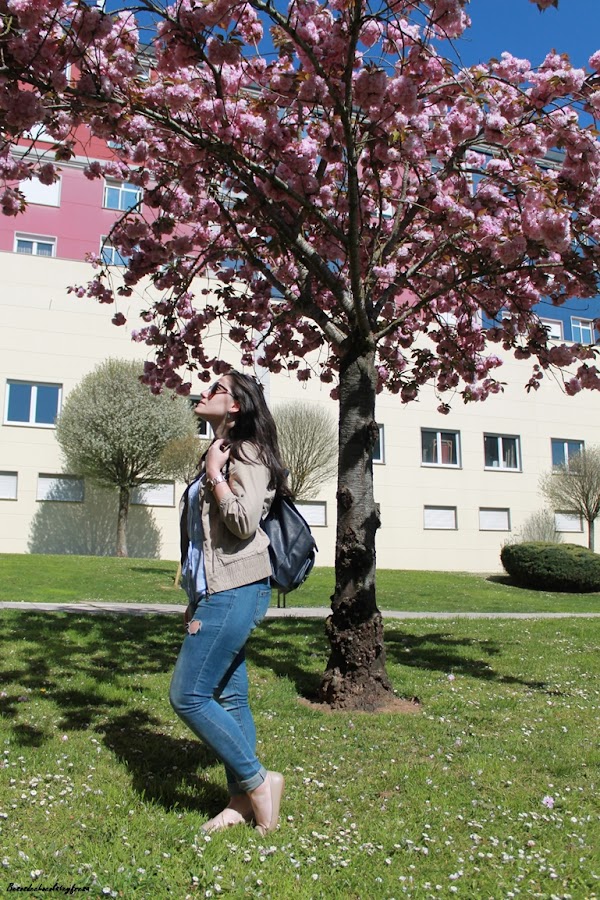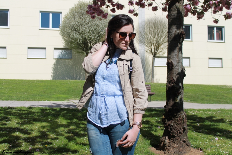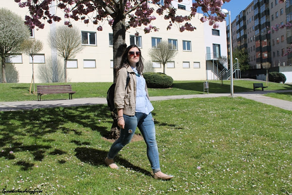 En el look de hoy os muestro prendas de otras temporadas en la que los colores predominantes son el azul y el nude. Llevo camisa de rayas en azul con chaqueta nude, jeans, bailarinas super cómodas en nude y plateado y como complementos, collar de flores, pendientes de sause con jade azul y perlas y mochila en azul marino.