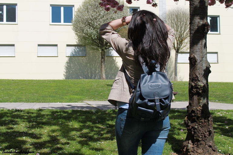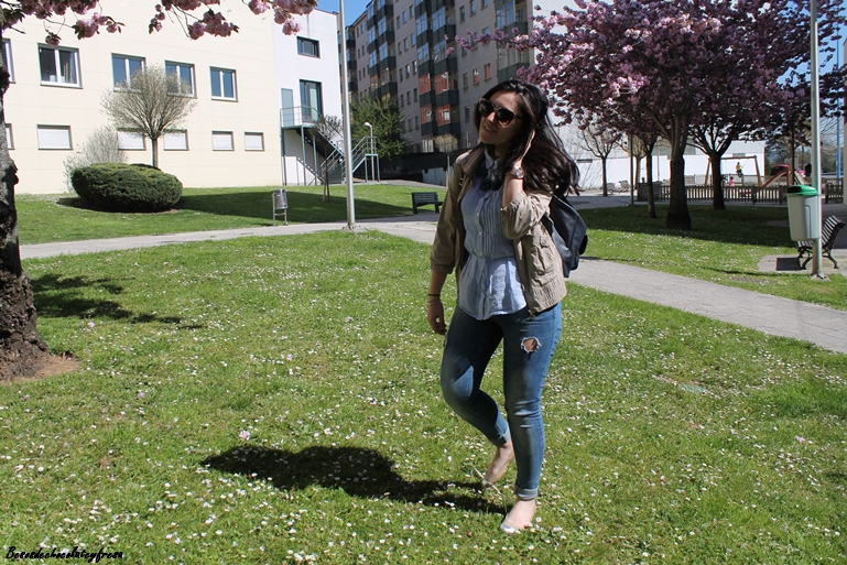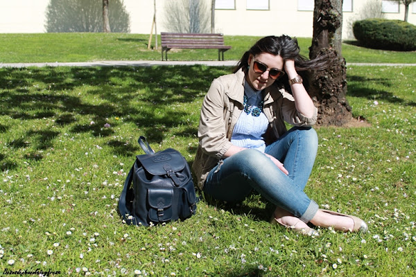 In the look of today I show you items from other seasons in which the predominant colors are blue and the nude. Ive been stripped in blue jacket with shirt nude, jeans, comfortable super dancers in nude and silver and as fashion accessories, Flower necklace, earrings sause with blue jade and pearls and backpack in Navy Blue.