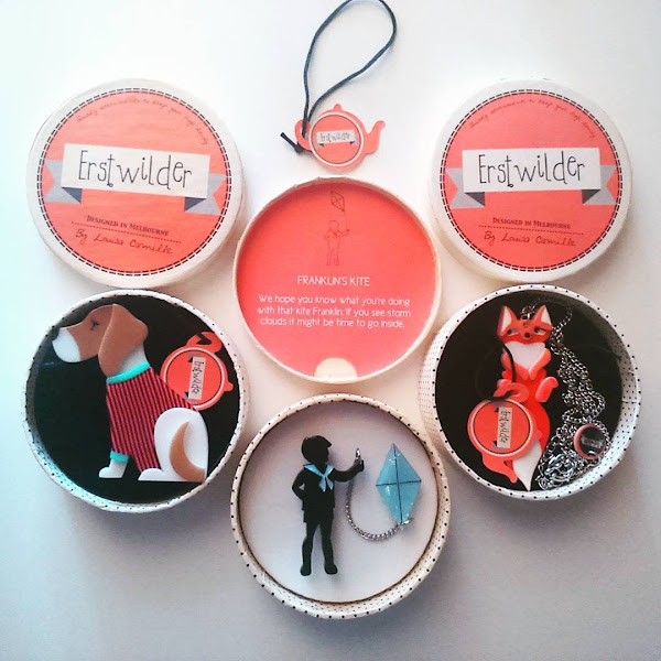 También quería hablaros de una firma de accesorios que descubrí hace poco, se llama Erstwilder, con sede en Melbourne y tienda online nos permite encontrar broches, collares, pendientes... con gran variedad de modelos y temáticas distintas, diseñados por Louisa Camille, todos ellos elaborados artesanamente con resina. Piezas únicas y originales y además edición limitada que vienen con una presentación ideal con estas cajitas tan cuquis!!!