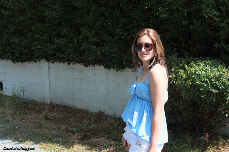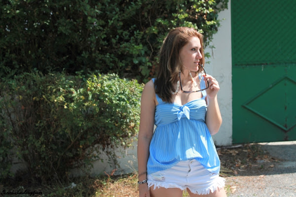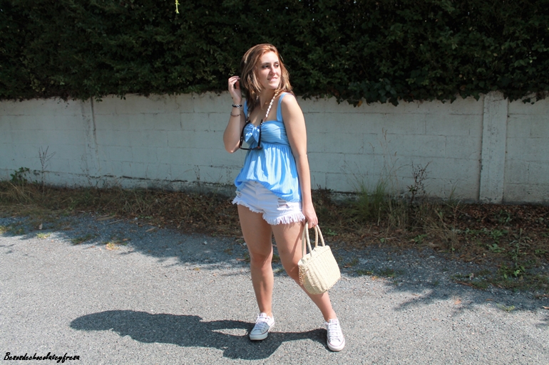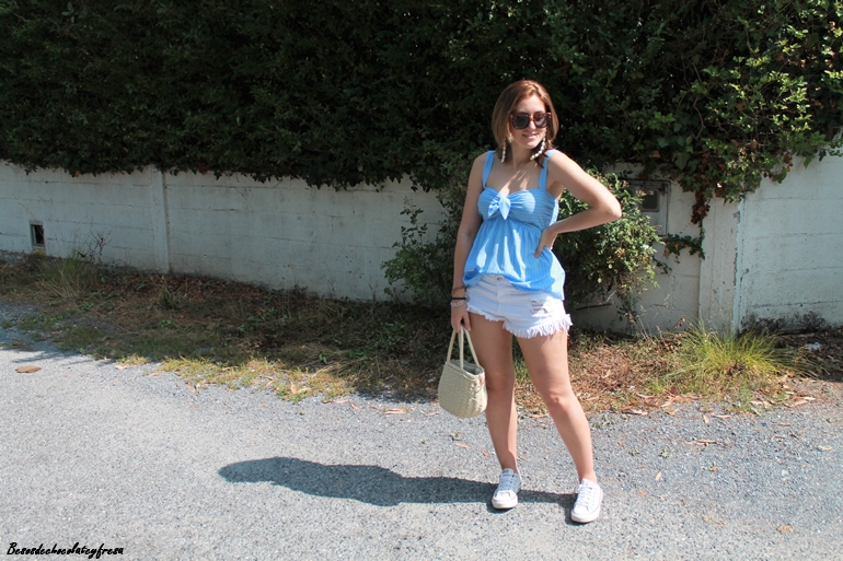 En el outfit de hoy os muestro esta tendencia de la mano de un top muy fresquito y versátil en azul celeste con rayas en blanco, el clásico navy. Esta vez lo he combinado con shorts blancos desflecados, sneakers y capazo de rafia.
