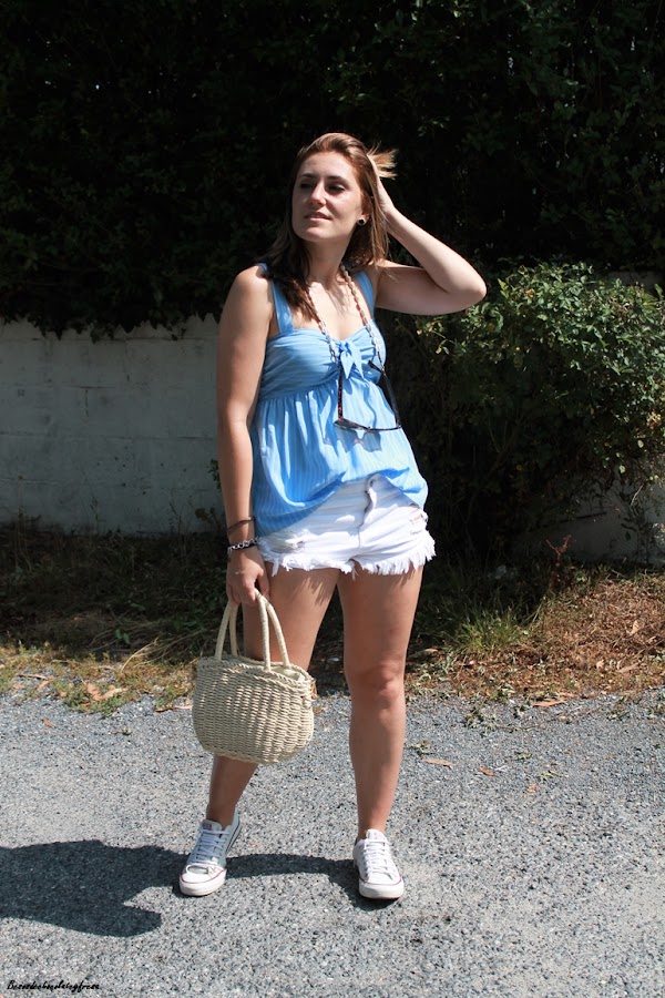 En el outfit de hoy os muestro esta tendencia de la mano de un top muy fresquito y versátil en azul celeste con rayas en blanco, el clásico navy. Esta vez lo he combinado con shorts blancos desflecados, sneakers y capazo de rafia.