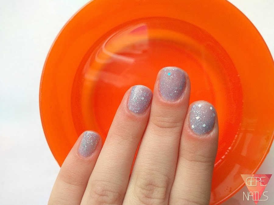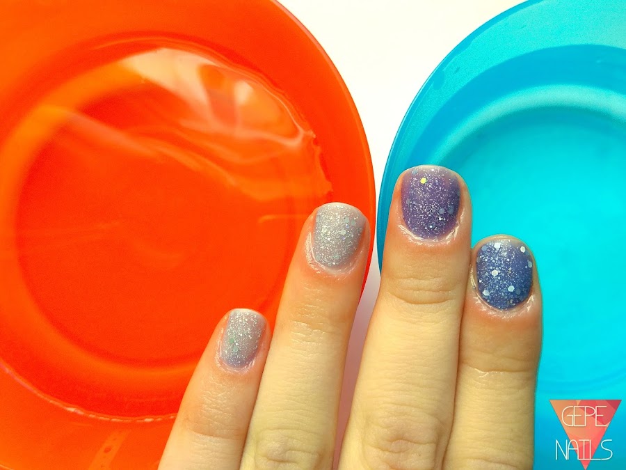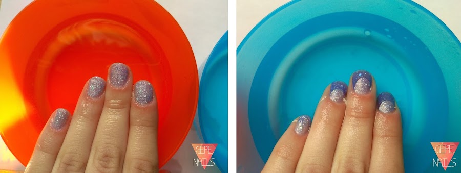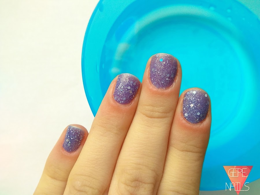 Como veis, es bastante evidente el cambio. Cuando se hace casi transparente (con calor), no queda nada soso porque tiene purpurina, que decora las uñas incluso cuando no tiene color.