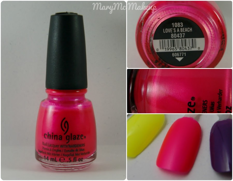 Love"s a beach: tono rosa neón con destellitos que cuando seca queda con acabado mate/satinado. Es lo único que no me gusta, con un top coat de brillo queda espectacular.
