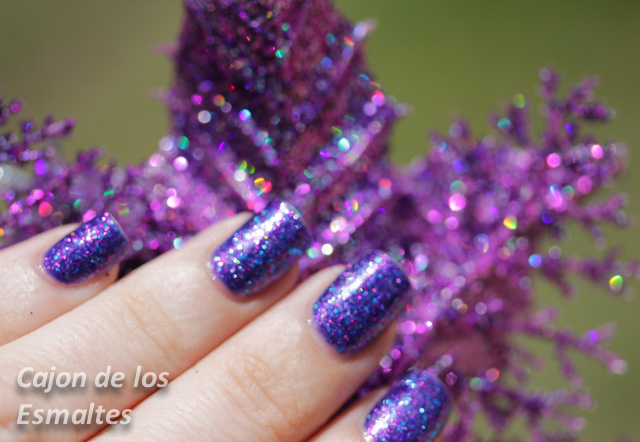 Oberon está compuesto por una base transparente y repleta de glitter de tres colores: azul, rosado y violeta y dos formas (cuadrados y unos pocos hexágonos). Con dos capas se podría cubrir toda la uña pero en las fotos usé una mano de Amethyst de Blosst y encima una de Oberon fue más que suficiente. Las fotos no le hacen justicia, no tiene partículas holográficas pero el brillo al sol es impresionante.
