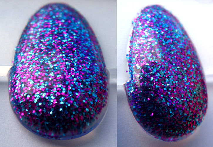 Varias chicas en Instagram con muy buen ojo cantaron el parecido con Frenzy de Sinful Colors. No tengo fotos mías para la comparación pero buscando un macro donde se ve que la combinación de colores es muy similar. La diferencia es que Frenzy tiene solo dos tonos y todos los glitters del mismo tamaño.