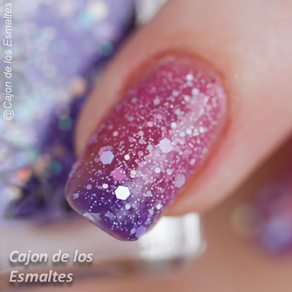 Hoy quería mostrarles una curiosidad en esto de los esmaltes de uñas, en este caso son fórmulas que cambian de color según la temperatura ambiente lo que se presta para juegos interesantes. Para darle además un toque especial estos esmaltes son semi-transparentes (jellies) y tienen partículas holográficas de varios tamaños lo que hacen que al sol sean una verdadera fiesta nuestras uñas.