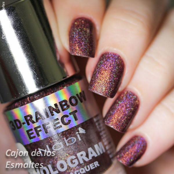 Y vamos con el segundo, Nabi 3D Purple. Hermano de Tawny en todas sus virtudes y defectos. Lo que no me decido es si me gusta más en versión holográfica sin topcoat (índice y medio) o en versión casi sin holografía pero super brillante (anular y meñique).