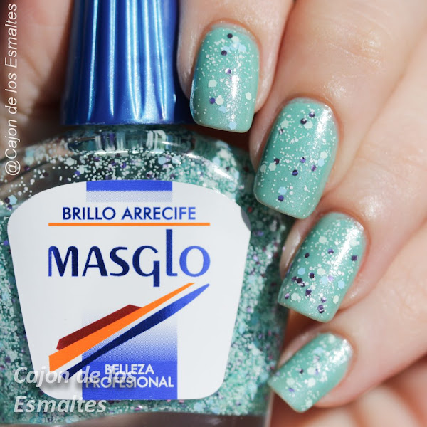 Post cortito y programado mientras estoy de vacaciones (no me odien). Hace unas semanas les mostré varios esmaltes de la marca Masglo que se empezaron a comercializar en Uruguay (yay!). Me faltaba probar alguno de los glitters que trajeron y me saqué las ganas comprando en Las Margaritas al color Arrecife.