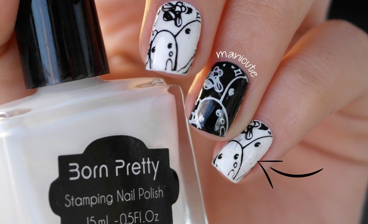 ¡Y por último, la perla! El esmalte blanco me fue genial, el diseño cogió fenomenal sobre la uña maquillada en negro...