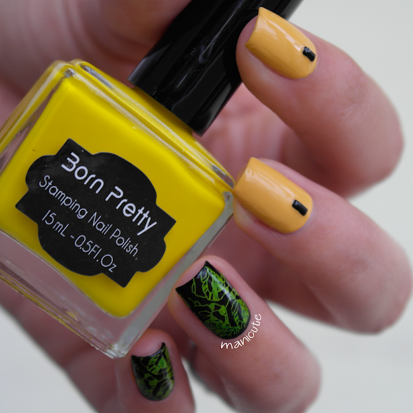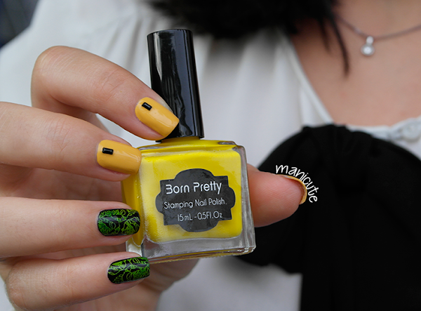 Como en otras colaboraciones, la web china me ofreció elegir entre varios productos, así que (entre más cosas que ya os enseñaré), quise pedir otro esmalte especial para estampar. En este caso, un esmalte amarillo; éste tenía más intensidad, ya no era tan pastel, así que quise probarlo sobre base negra...