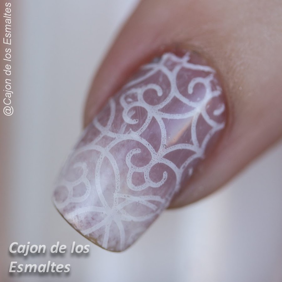 Tenía que aprovehar la base que hice con este degradé para estampar. Noten que aún sobre las puntas casi blancas resalta el estampado también en blanco así que la opacidad es muy buena.