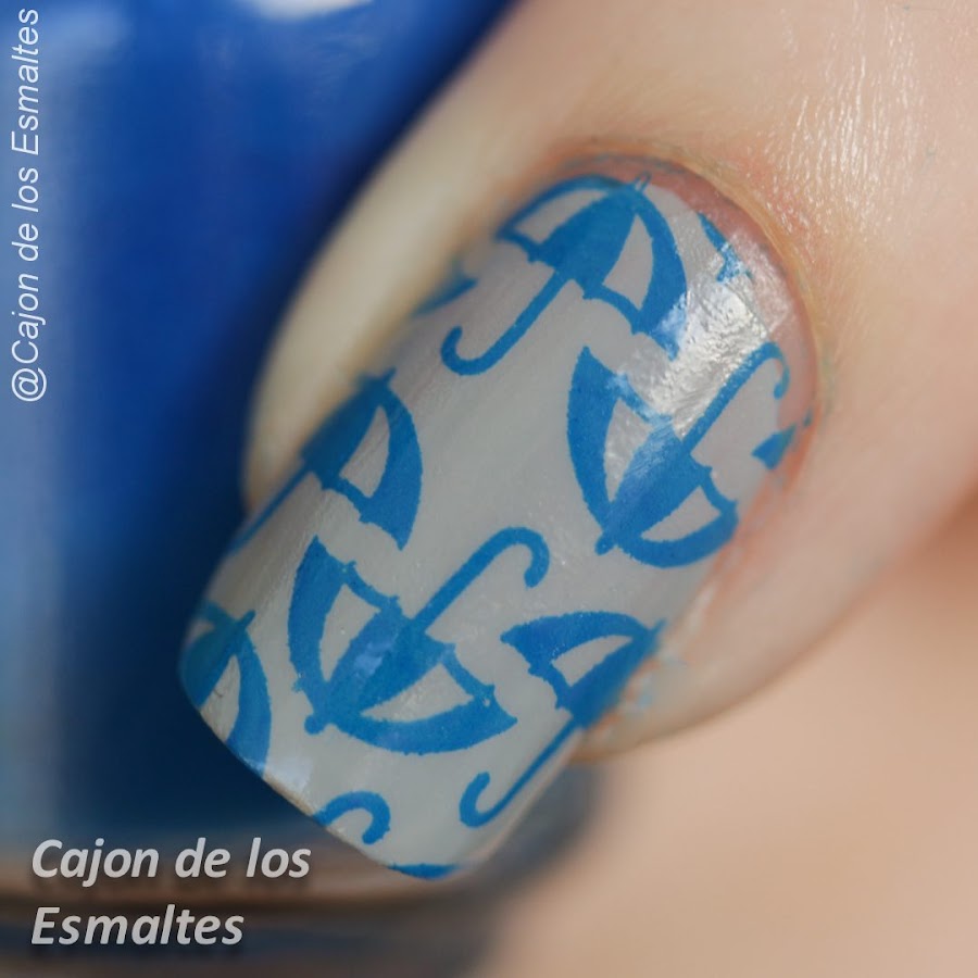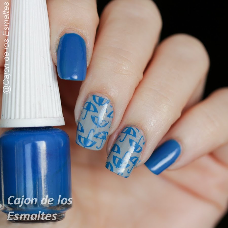 Vamos con el segundo, un azul oscuro tirando a marino. No funciona sobre tonos oscuros o negro, pero con tonos de medios a claros de base va perfecto. Haciendo honor a este otoño más que lluvioso hice un nail art basado en gris, agua y paraguas, resumen perfecto del tiempo estos días pasados. La placa de los paraguas es la BP-L023 también de BornprettyStore.