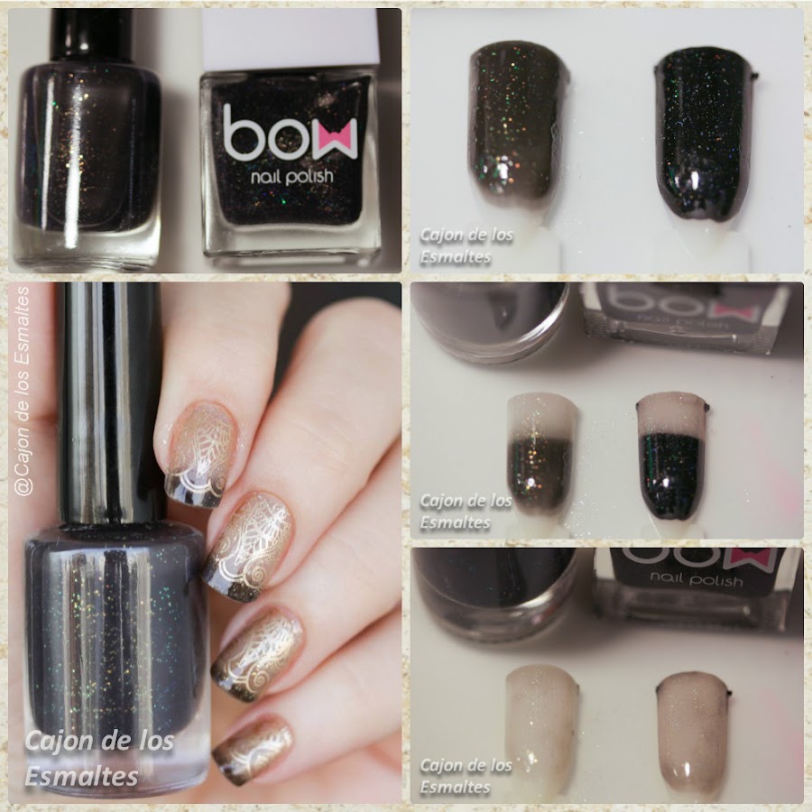 Y la última antes de irme, la marca rusa Bow (de la misma empresa que hace los Dance Legend) sacó el año pasado una serie de esmaltes térmicos, uno de ellos que iba de un tono marfil casi transparente a negro profundo con pequeños brillos holográficos. Por esas cosas del destino llego hasta mis manos y les puedo hacer una comparación entre ese esmalte y el de Syl, una foto vale más que mil palabras para que vean lo similar que se ven yl les punteo las diferencias: