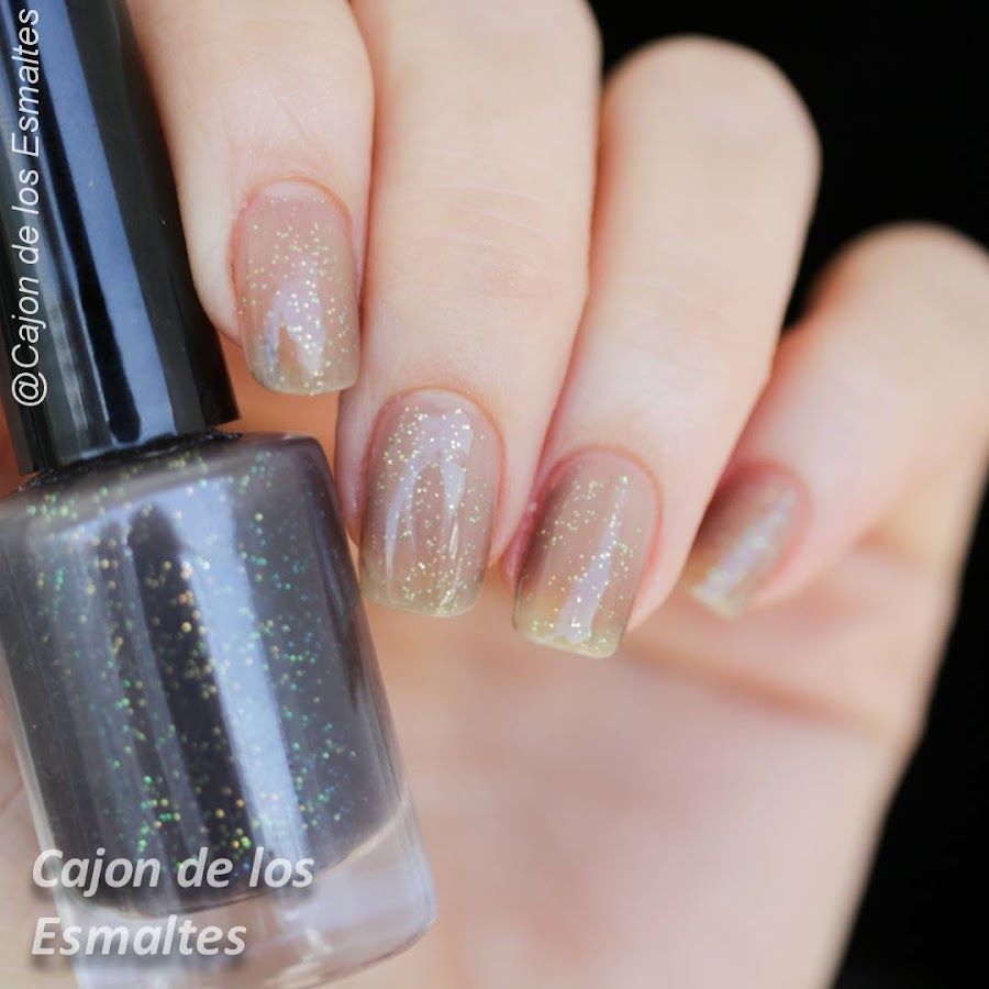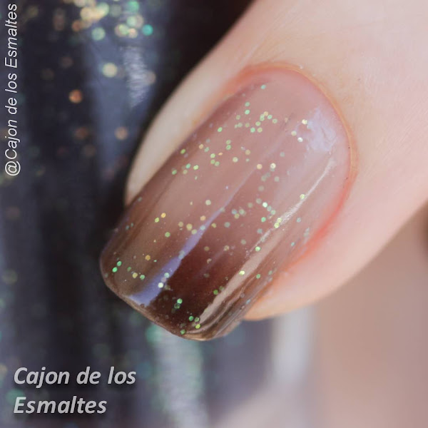 Les muestro ahora el esmalte solo para ver los cambios de color y el glitter verde/dorado que tiene.