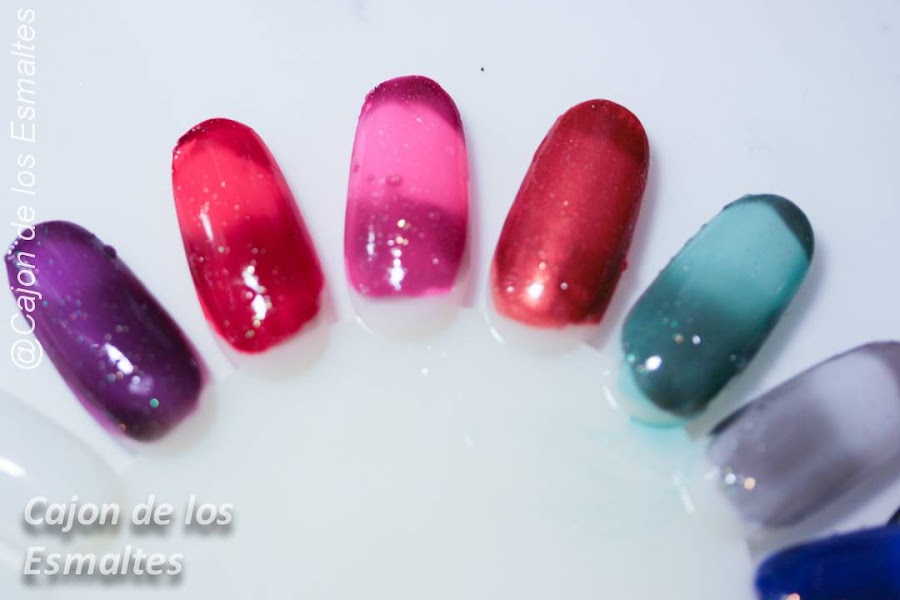 Como les comentaba arriba el esmalte es bastante translúcido (por eso lleva tres manos) pero ese mismo detalle hace que se pueda usar con una mano por encima de otro tono para transformarlo en un esmalte térmico. Les dejo como ejemplo unas pruebas que hice sobre un uñero con diferentes colores y una mano del topper térmico, luego sumergí el uñero en agua caliente hasta la mitad para que puedan ver como cambia el color de oscuro a claro, en las puntas ya se empezó a enfriar y vuelve a retomar el tono más oscuro.