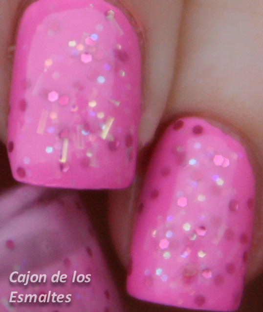 Más allá que el rosado chicle no es mi color favorito no dejo reconocer que es hermoso. Además del jelly rosado esta compuesto de glitter hexagonal rosados e iridescentes además de algunas barras semi-traslúcidas. A mi cámara le cuesta el macro así que sepan disculpar las tomas.