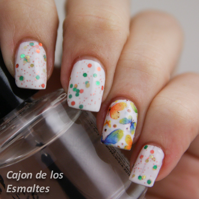 Para no terminar con sabor amargo el post les dejo otra foto del Milk Cupcake, mi favorito de Juliette por el momento, agregué un sticker en la uña anular (comprado acá) que combinaba con los colores del glitter. Primera vez que uso stickers de uña completa y la verdad que gratamente sorprendida, fácil de aplicar, no se ve "falso", o sea, podría pasar perfectamente por un decal y una base blanca. Nail art for dummies con todo el respeto del mundo para los dummies porque todos arrancamos así y tenemos momentos de esos cada tantos. Se abre un mundo nuevo de posibilidades...