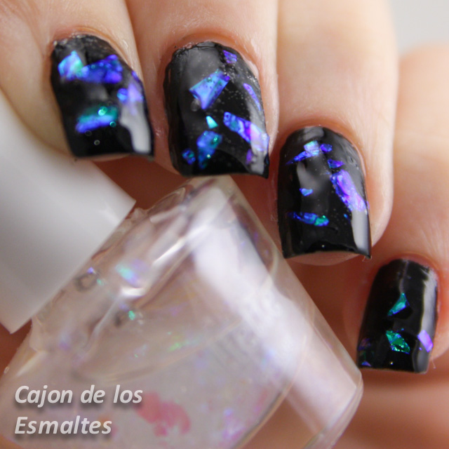 Saturadas ya de tanto rosado pasamos ahora al flocado 3D Glam sobre una base de negro. En la botella prometía mucho, base transparente, flakies o escamas que cambian de color yendo del azul al verde al violeta. Está más cerca de las escamas de los Moon Candy de Revlon que de los de Paz e amor de Impala.