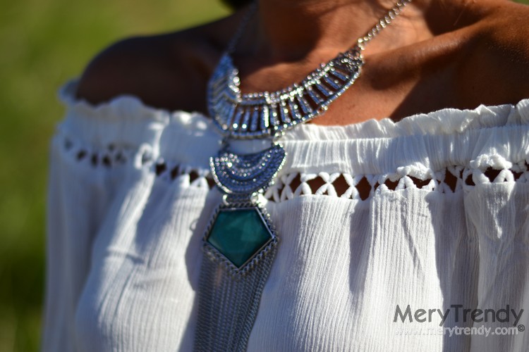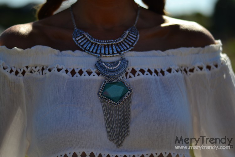 Para realzar un poco la prenda, nada mejor que un maxi collar largo como éste, con una gran piedra en verde esmeralda.