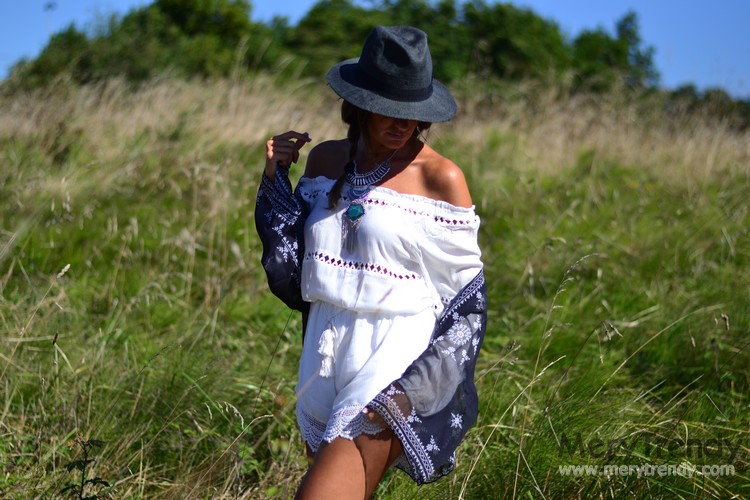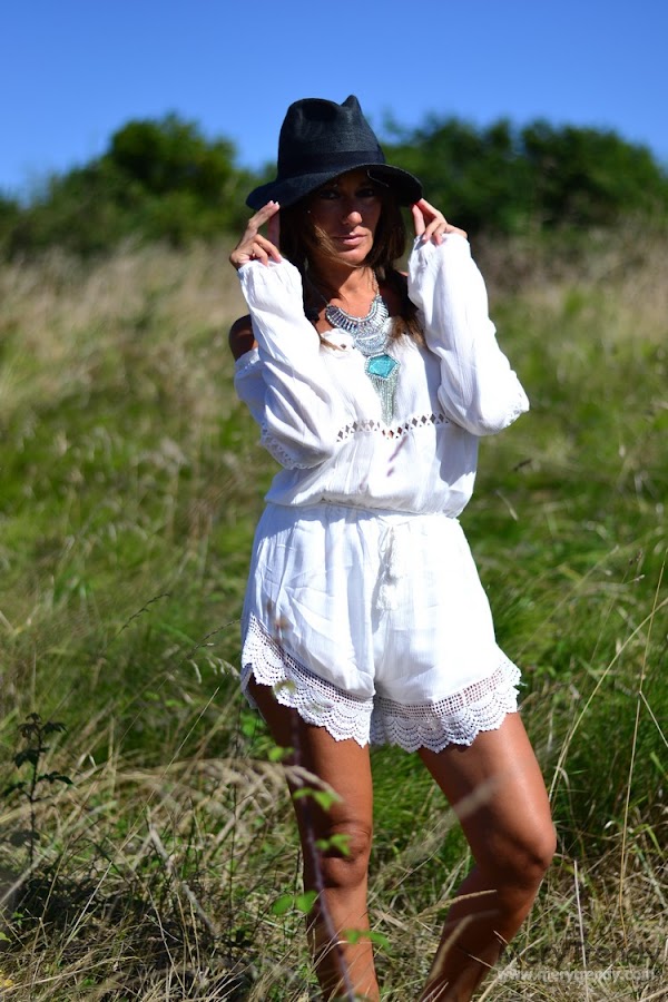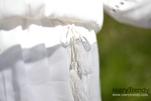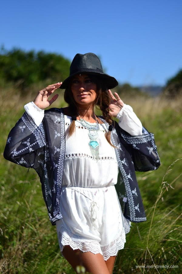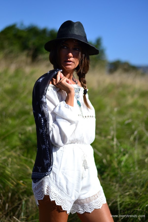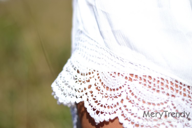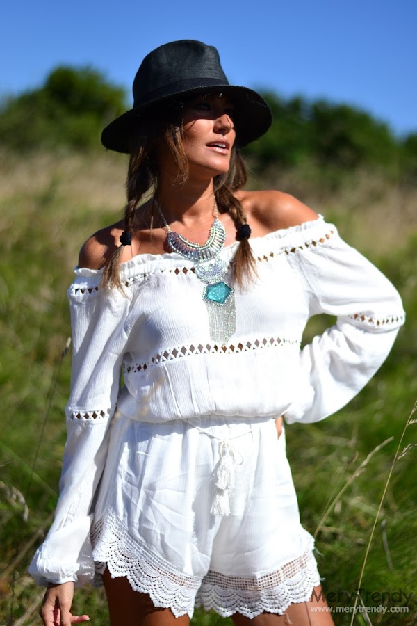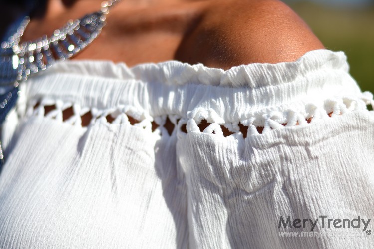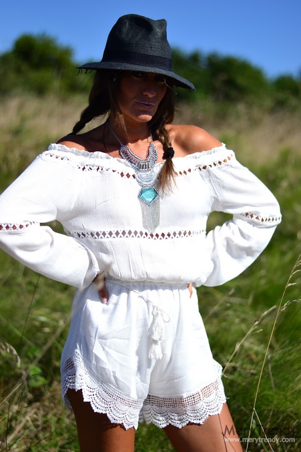 Como pieza central, un mono corto con los hombros al aire (escote barco) y manga larga remangable con goma en la muñeca. De cintura elástica y con cordón para atar, me pareció perfecto para ir holgada. Además, el detalle del encaje le da un puntito lencero que me encanta.