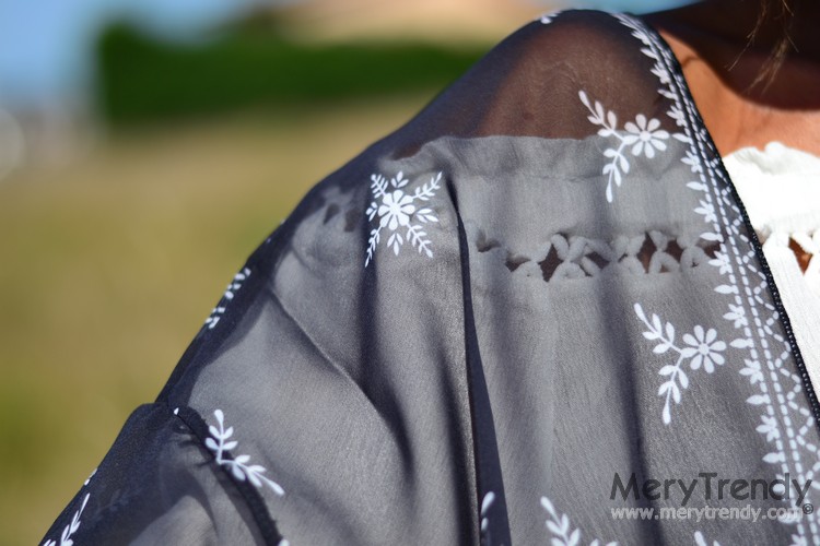 Y para poner por encima al caer la tarde, este kimono de gasa con manga tres cuartos, estampado de flores en azul marino y negro.