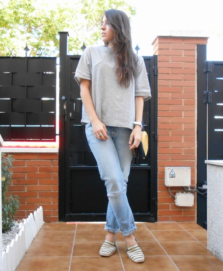Today I want to show you a new look in which all the items are from sales. It is composed of jeans, which are a must in every closet; a baggy t-shirt, espadrilles, which are perfect for these summer days, and a yellow bag.