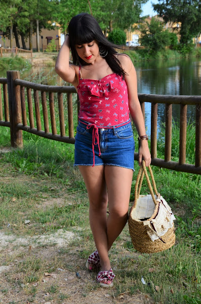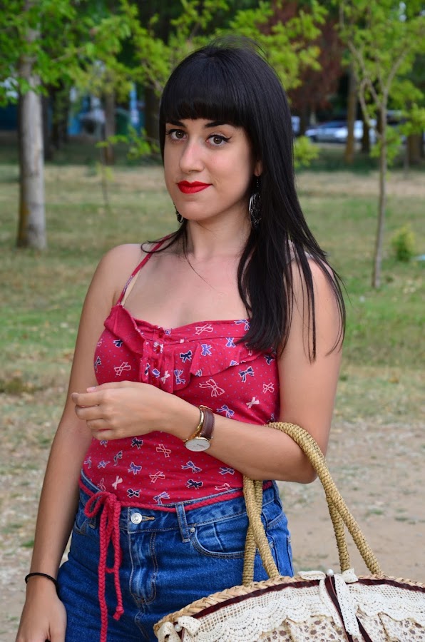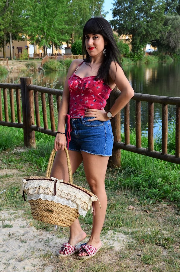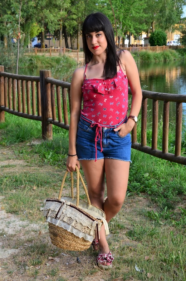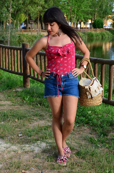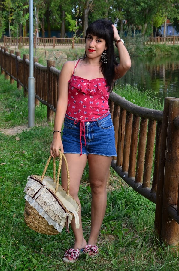 El look es sencillo; una camiseta de lazos de hace ya unos cuantos años, shorts y capazo que lo hacen el outfit ideal para ir a la piscina o playa en su caso.