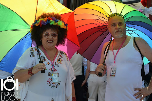 La cantante Lirico Pop Karol Luque junto al Quiromasajista Manuel, ambos con look blanco y grandes paraguas con los colores simbólicos de la Pride