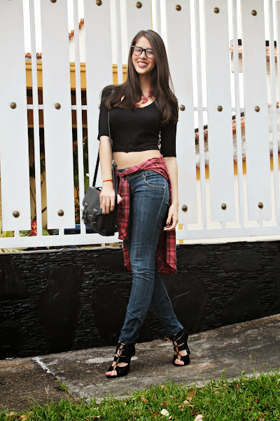 Crop top : Glam Trendy / Camisa de cuadros: Bershka / Jean: Krazy Kat / Zapatos: Aishop / Collar: LuJo Accesorios / Bolso: Balu