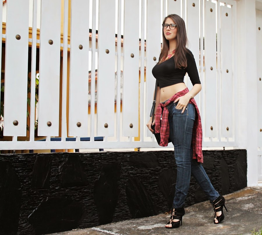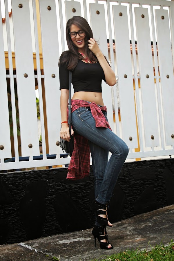 Crop top : Glam Trendy / Camisa de cuadros: Bershka / Jean: Krazy Kat / Zapatos: Aishop / Collar: LuJo Accesorios / Bolso: Balu