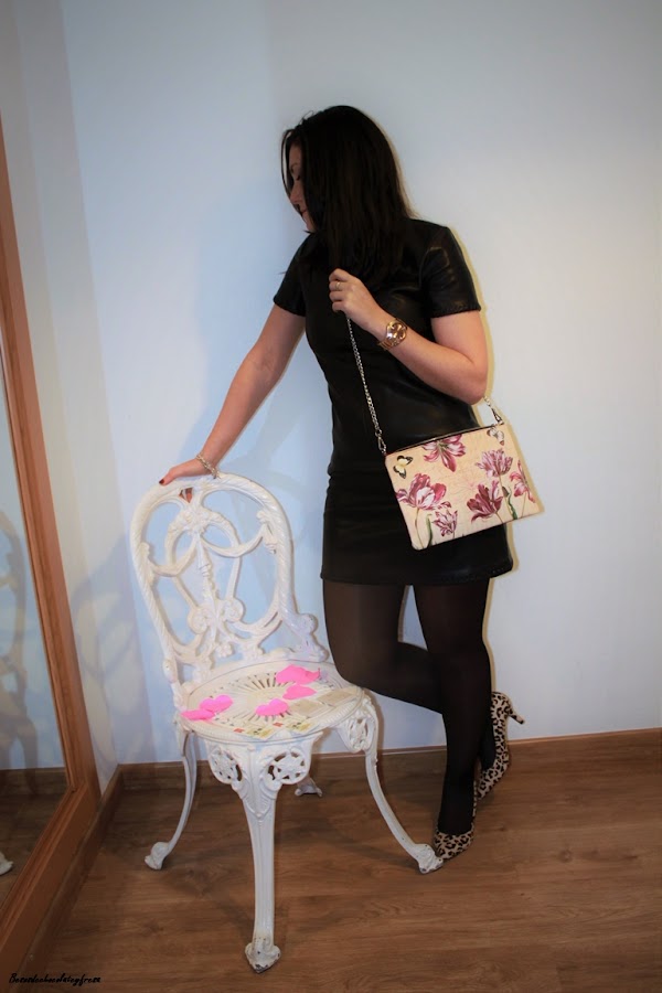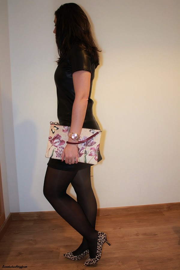 ¿Por qué para ellas? Para ellas, como ya os dije antes os muestro un look formal para salir a cenar o comer con vuestra pareja el proximo Domingo, dia de San Valentín, un día especial (aunque el amor se debe demostrar todos los días pero es una excusa más para pasar un rato íntimo con vuestra pareja). Llevo vestido entubado de cuero y escote en pico sexy que alude a la insinuación, con stilettos de animal print. (un tanto felina jiji)