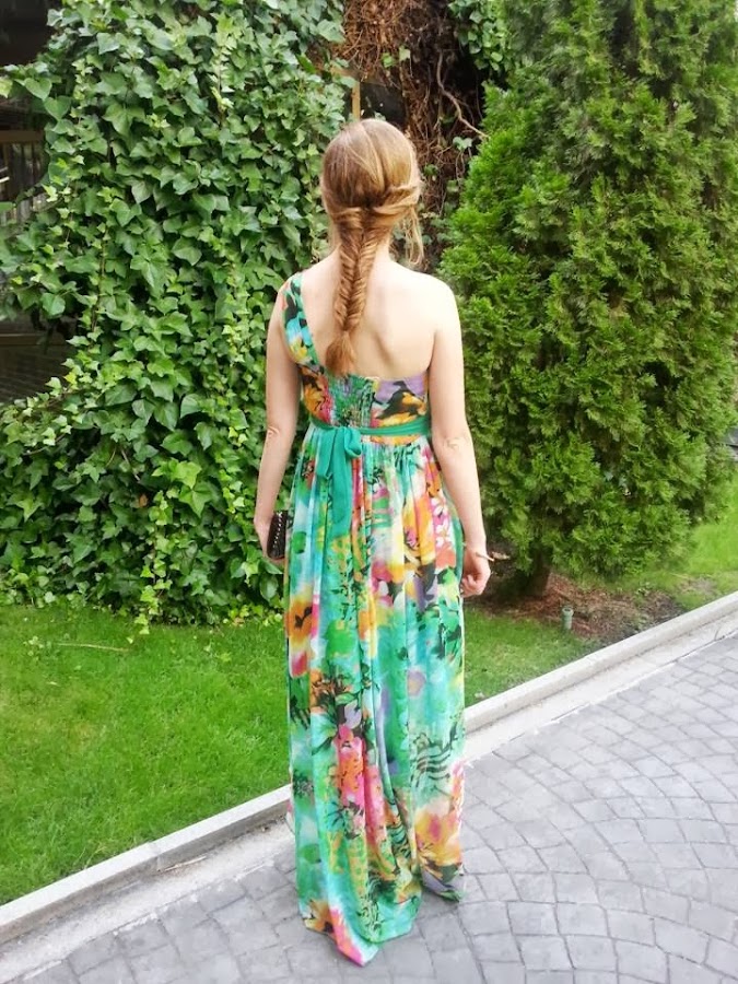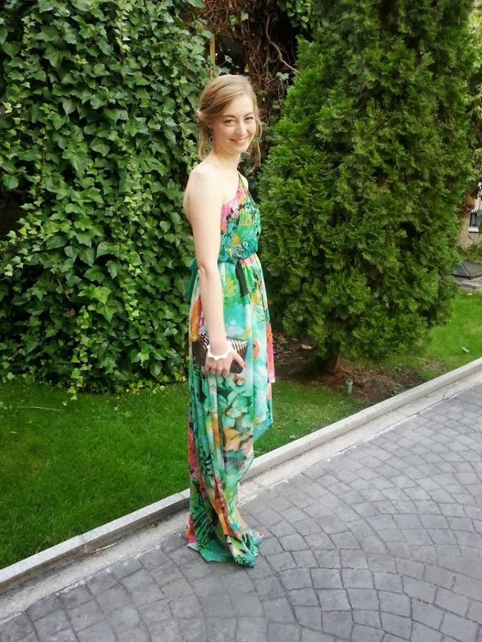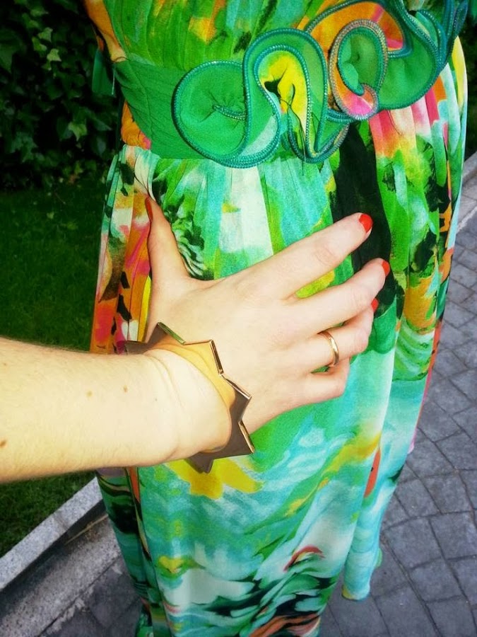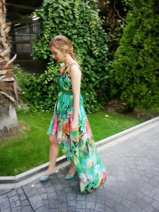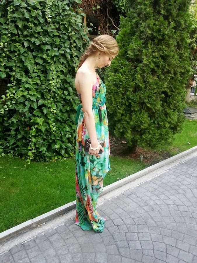 Encima, mi mejor amiga me prestó este vestidazo que se había comprado en una tienda de Denia. Cuando me lo enseñó por foto vía whatsapp me encantó el color, el estampado tropical y el corte. ¡Qué ilusión llevarlo!