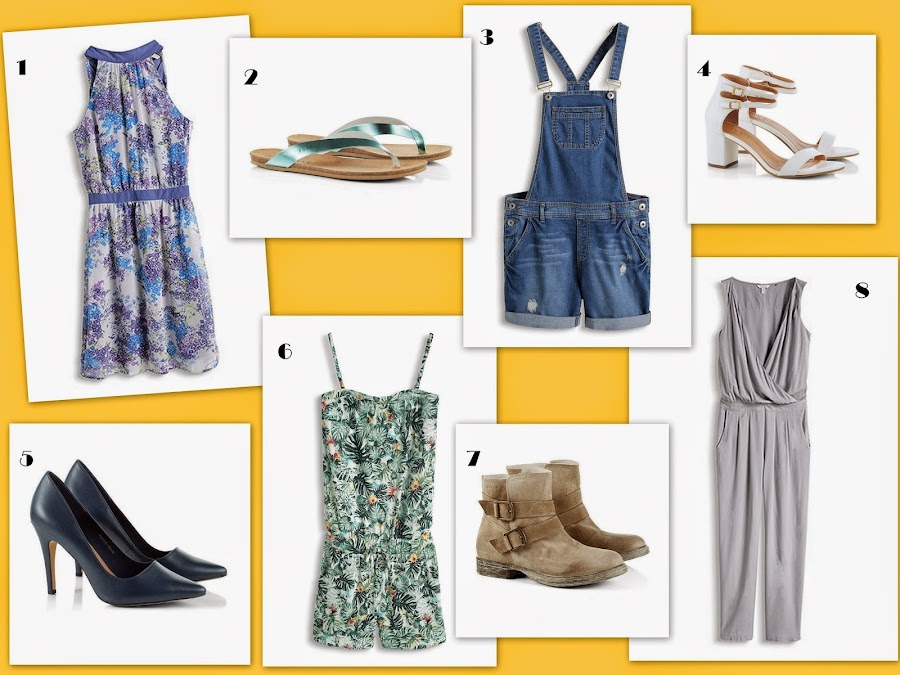 1- Vestido gasa AQUÍ 2- Chanclas metalizadas AQUÍ 3- Peto vaquero AQUÍ 4- Sandalias blancas AQUÍ 5- Zapatos azul marino AQUÍ 6- Mono estampado selvático AQUÍ 7- Botines hebillas AQUÍ 8- Mono cruzado AQUÍ