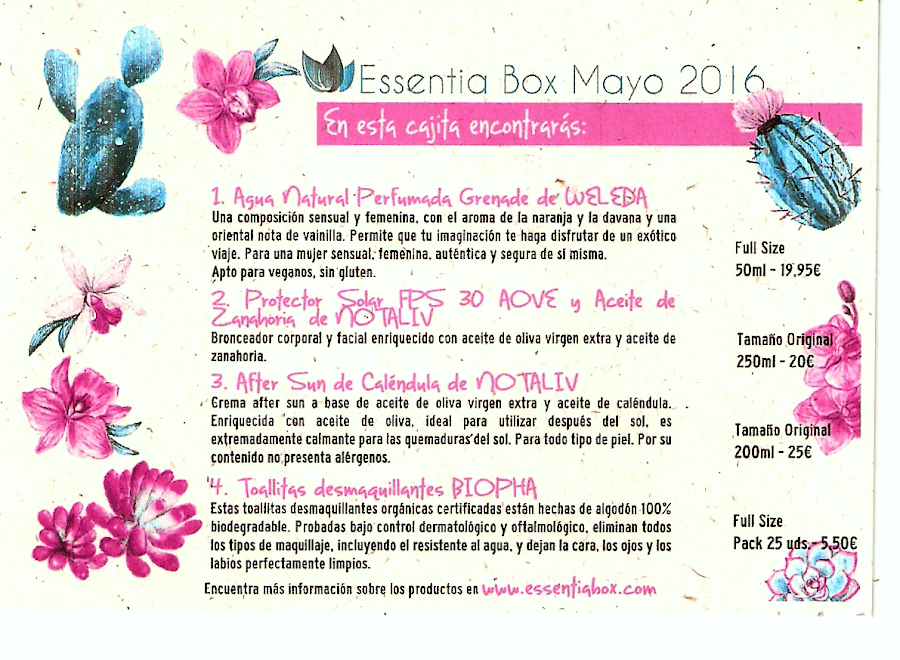 La cajita Essentia Box de este mes de mayo me ha encantado. Contiene productos de cosmética natural que me vendrán muy bien para este verano 2016. Seguramente los volveré a comprar en un futuro :D