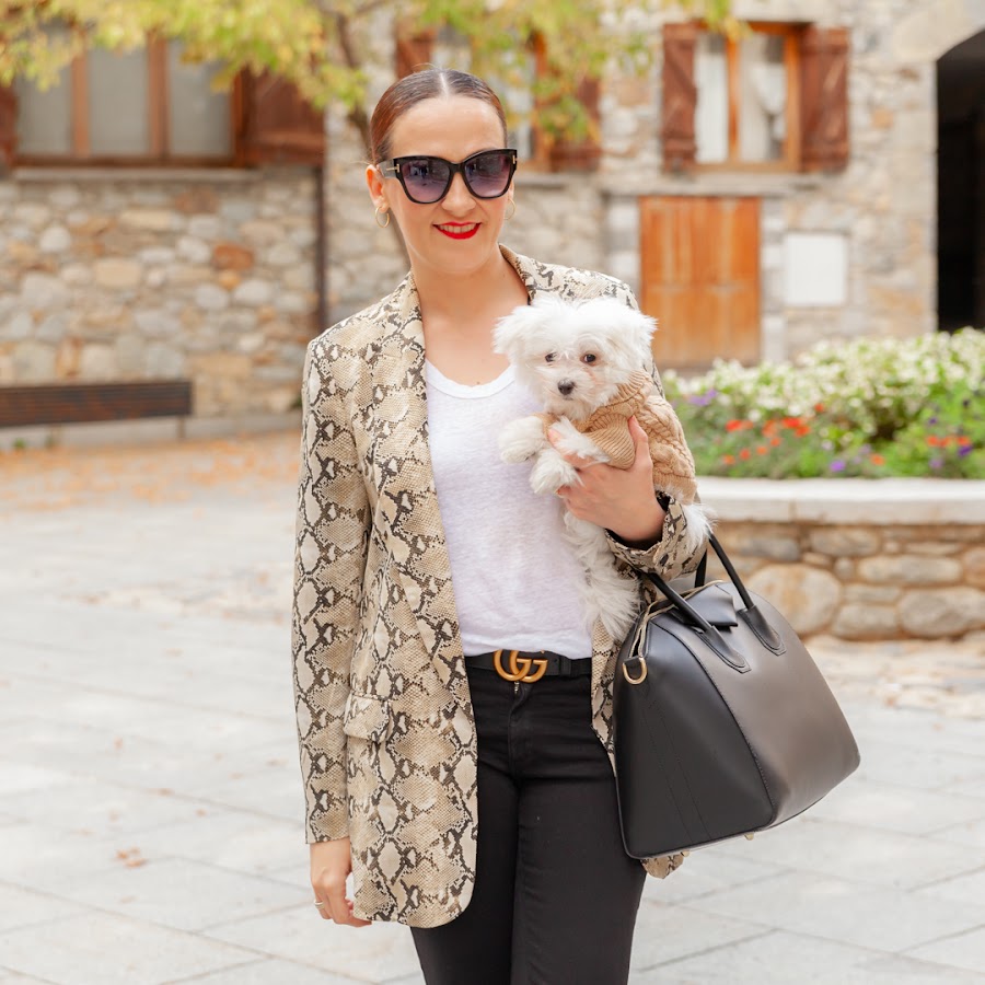 Ya sabéis que el estampado de leopardo desde siempre me ha gustado, en cambio el de serpiente tan apenas me llama la atención. En cambio, esta temporada este print me han enamorado tanto en la blazer que os muestro hoy como en unos jeans de Zara que pronto os enseñaré. Como siempre el animal print me gusta llevarlo en su justa medida, un ejemplo es como os lo enseño en las fotos donde lo combino con prendas básicas como una camiseta blanca y jeans negros.