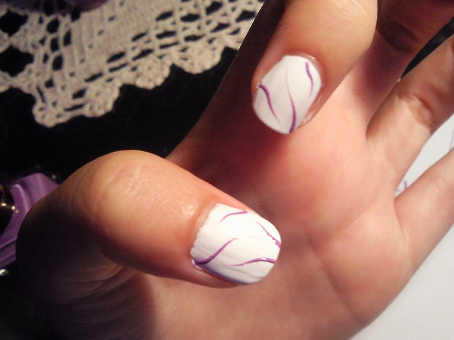 Una vez hecho esto, usamos el pincel para líneas y el esmalte morado, y hacemos unas cuantas por la uña, en distintas direcciones y con un poco de curva.