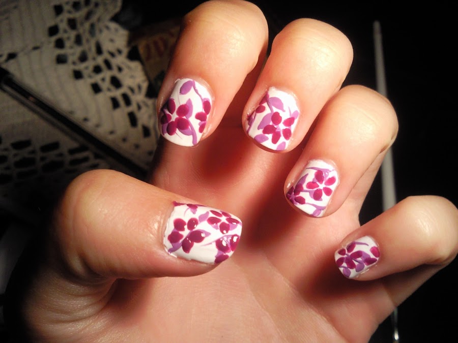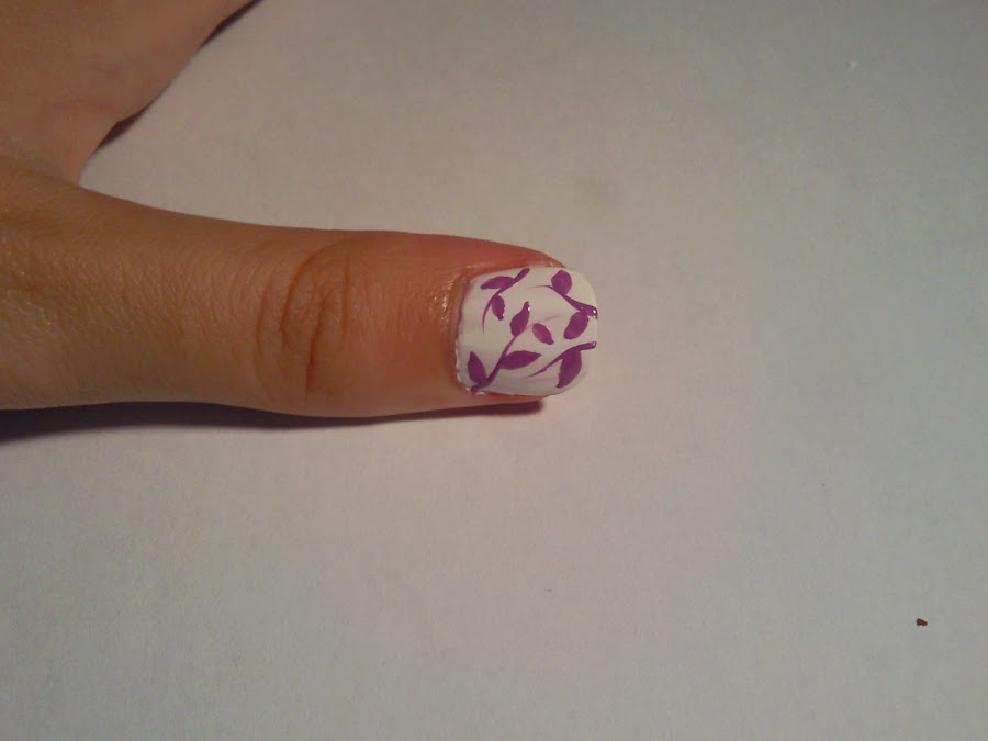Si hasta este momento has cometido algún fallo, no te preocupes, puedes taparlo en el siguiente paso. Usamos un esmalte morado más oscuro y hacemos unas flores sencillas. Entonces el resultado final será este: