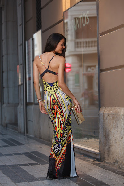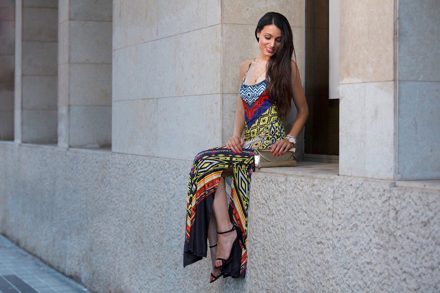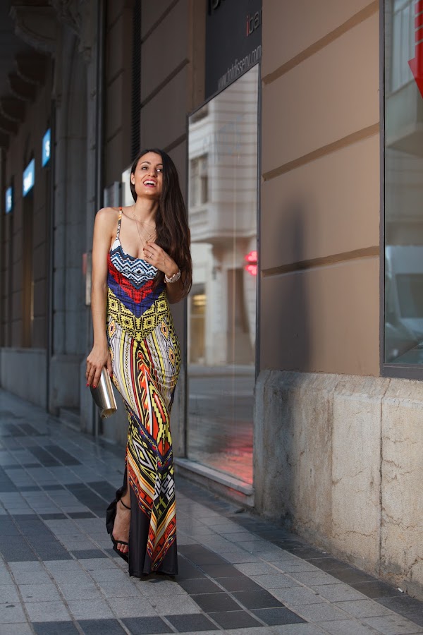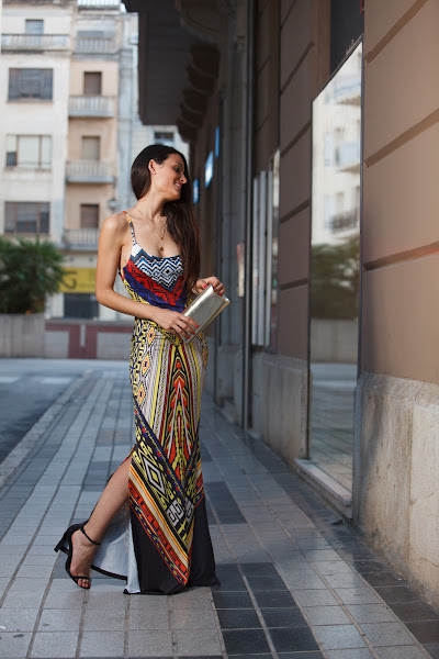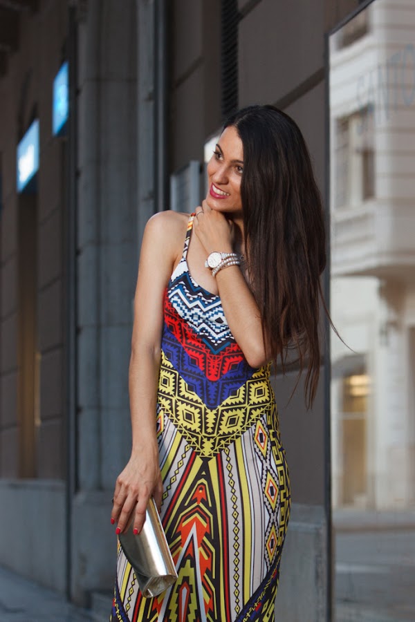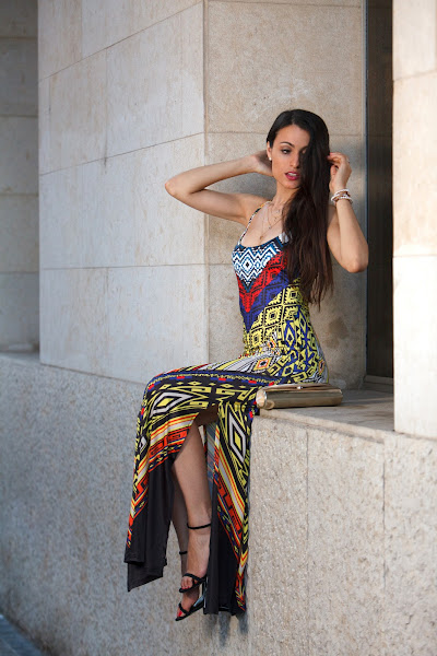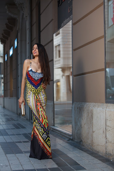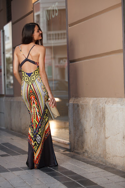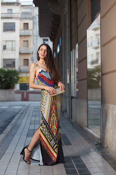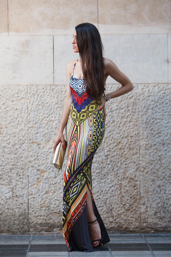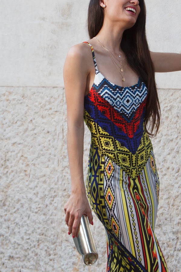 Estoy completamente enamorada de este vestido! Me encanta el corte estilo sirena y su alegre y colorido estampado étnico. El tejido es elástico por lo que se adapta genial y resulta muy cómodo.