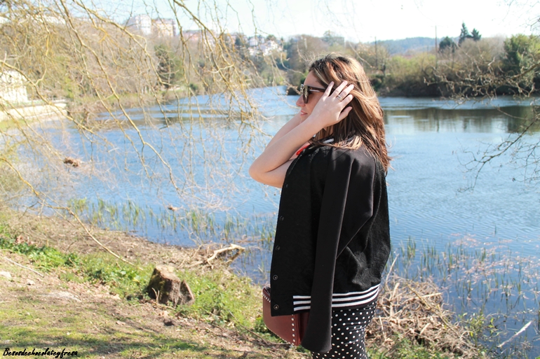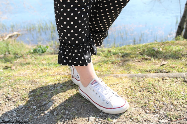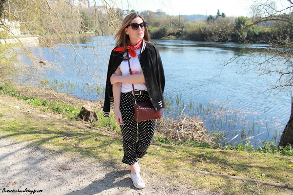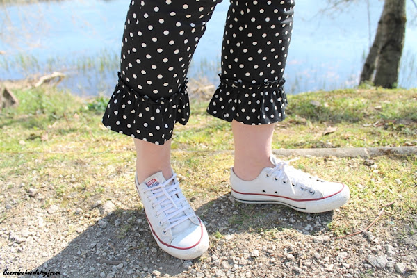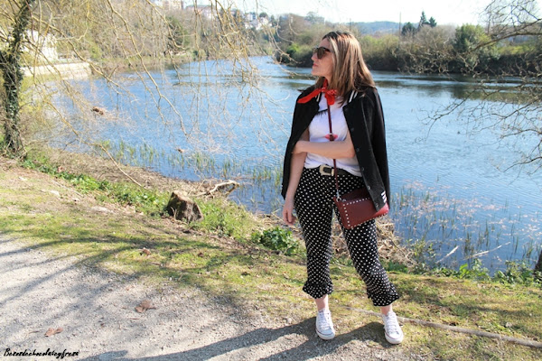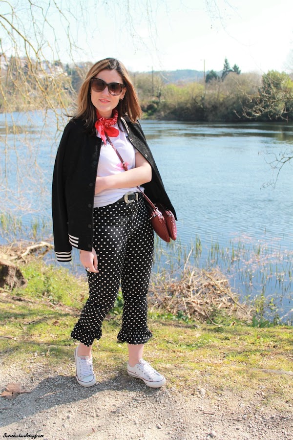 En el outfit de hoy os lo muestro en los pantalones de tela con el clásico negro con lunares en blanco con la diferencia de no ser unos pantalones normales que tienen un estampado de lunares, pues la gracia está en el bajo con volantes que los hacen diferente, original y divertido a la vez, así como atrevido, no apto para las más clásicas (o si...)